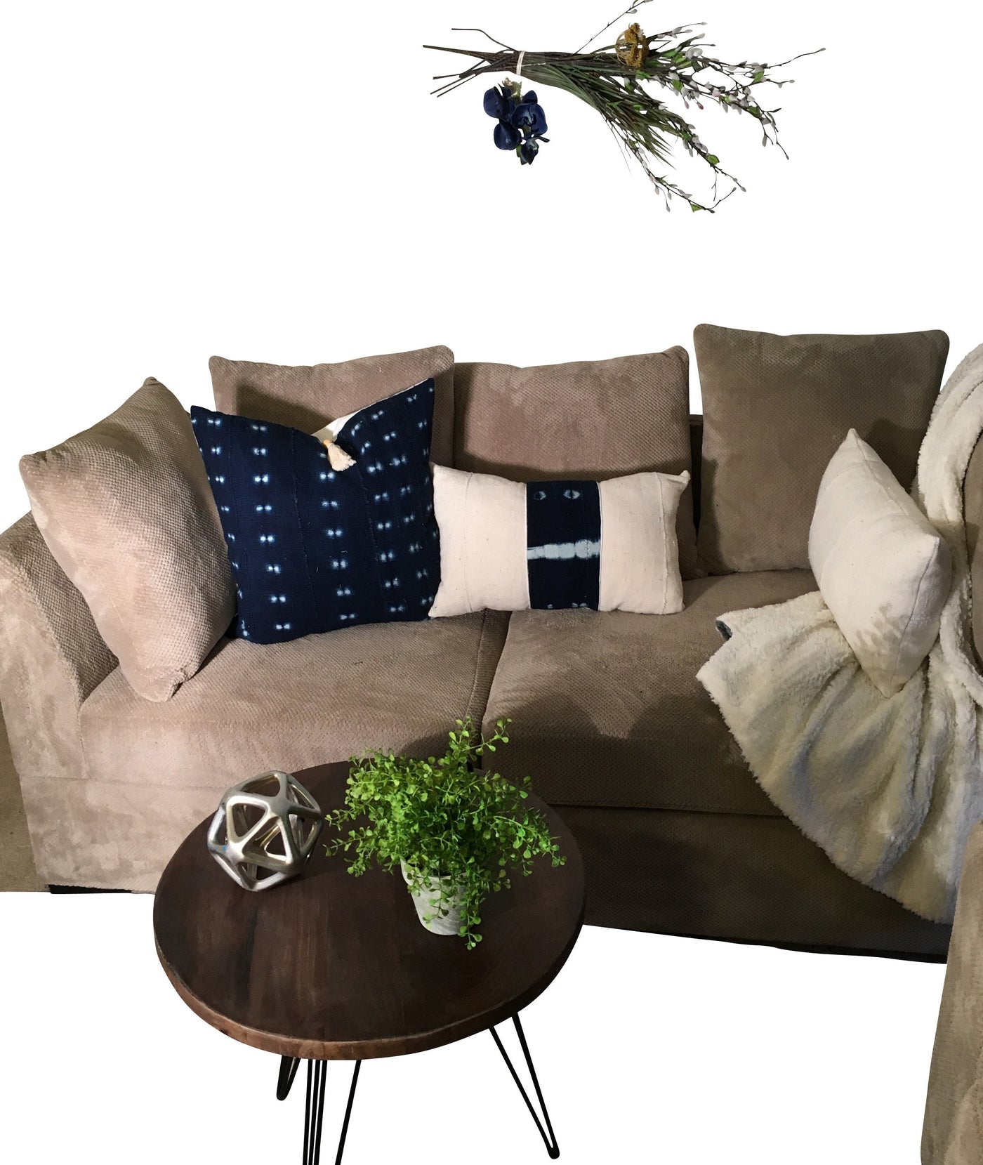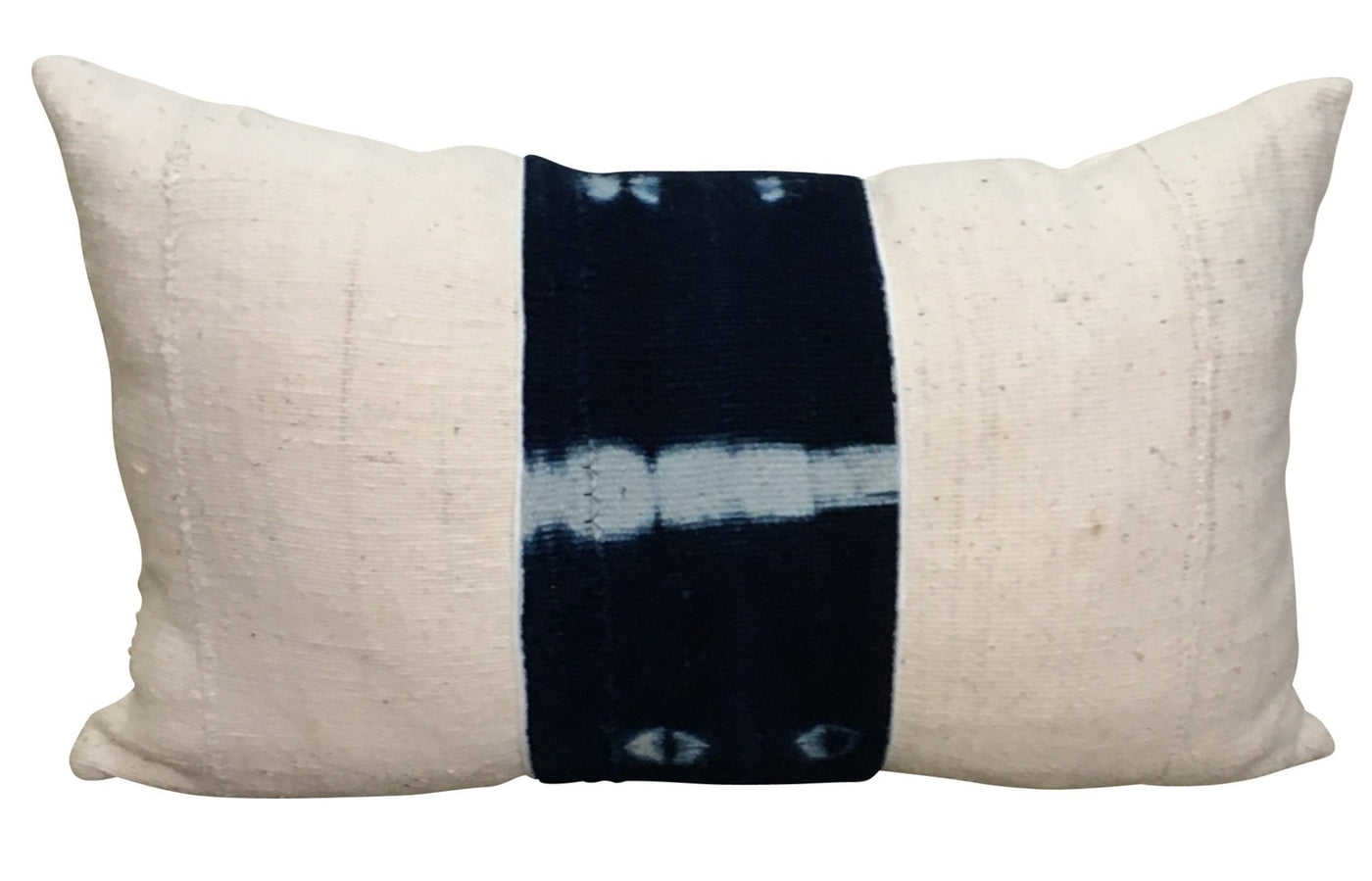 In an array of throw pillows the lumbar pillow is usually the first one seen due to its narrow yet dominant size. This indigo lumbar pillow displays our love of a one-of-a-kind dye-tie boho technique. DUE TO THE HANDMADE NATURE OF THE MUDCLOTH, IN MOST CASES THE CENTER PATTERN WILL DIFFER - DISTINCT BUT BEAUTIFUL. The back of the pillow is white linen and it is closed with an invisible zipper.