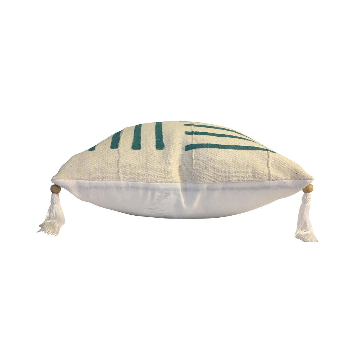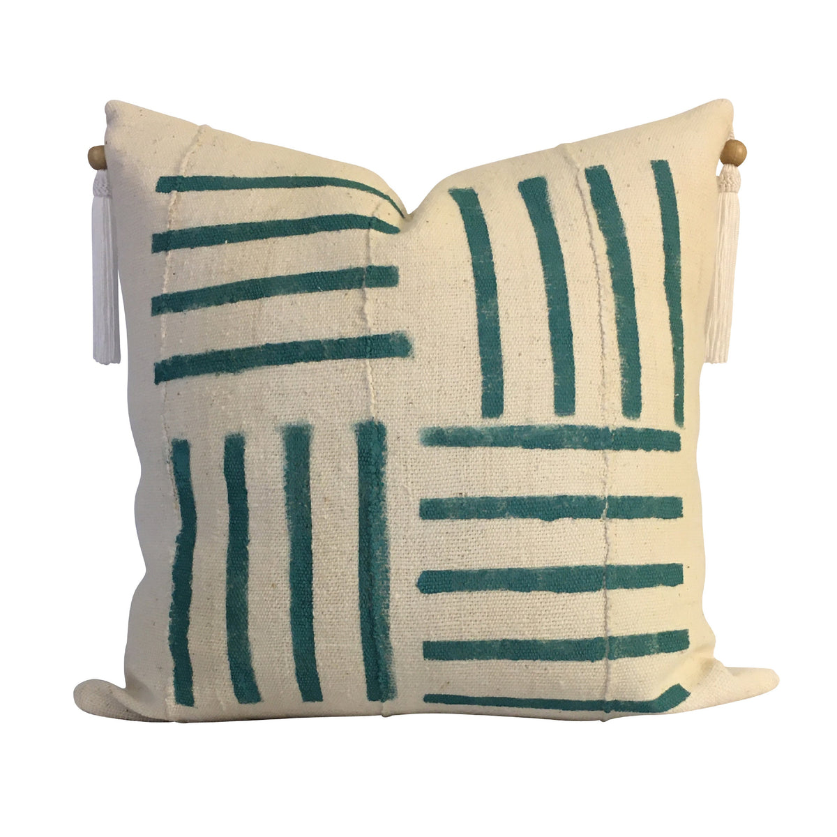 This white and blue mud cloth pillow, with its grayish blue stripes is the perfect mix of feminine and masculine tastes. Placed on each top edge is a tassel with a wood bead. The back is white linen or heavy-weight cotton and it is closed with an invisible zipper.