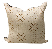 An eye-catching piped mud cloth pillow cover in brown and white. The back of the pillow is made of linen or heavy-weight cotton. It is closed with an invisible zipper.